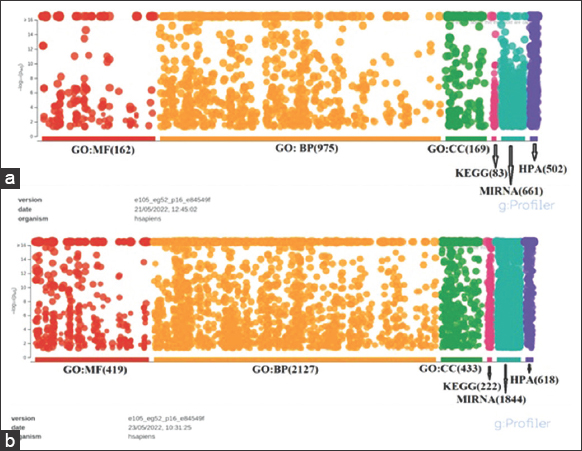We find that the functional ontology of the upregulated genes is using “g: Profiler” (https://biit.cs.ut.ee/gprofiler/gost) tool. DEGs are distributed in different functions of Biological Process, Molecular Function, and Cellular component [Figure 3]. The 20 functional categories and the pathways information are represented in Table 5. All the 1895 DEGs are distributed into four functional categories as shown in Figure 5 and Table 5. The 3987 DEGs belonging to Biological process, 764 DEGs in Molecular Function, 332 DEGs in Cellular Component, and 291 DEGs in KEGG pathways (Supplementary_Biological_Process_Up, Supplementary_Cellular_Component_Up, Supplementary_Molecular_Function_Up, Supplementary_KEGG_Up) are included in the supplementary materials. We found that the largest number of DEGs (8689) are involved in downregulation [Figure 6 and Table 6], which are functioning in different GO (Gene ontology) functions like Biological process (5755 number of DEGs), Molecular function (1175 number of DEGs), Cellular Component (490 number of DEGs), and KEGG pathways (316 number of DEGs) which are included in the Supplementary material (Supplementary_Biological_Process_down, Supplememtary_Molecular_Function_down, Supplementary_Cellular_Component_down, Supplementary_KEGG_down).