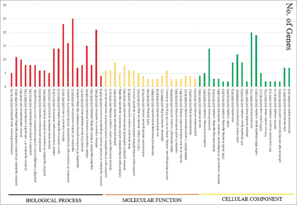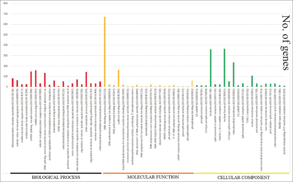 | Figure 5: The representation of upregulated gene-ontology functions such as Biological Process, Molecular Function, and Cellular Component. The lower side shows name of the functions and the horizontal axis shows number of genes regulated by each function in Figure 5. [Click here to view] |