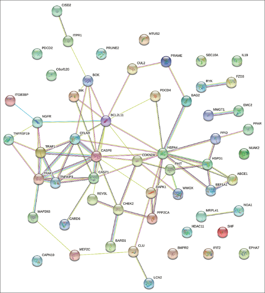 | Figure 7: An analysis of the protein–protein interaction network was conducted, focusing on genes associated with apoptosis, programmed cell death, tumor growth, and proliferation. The construction of the PPI network involved integrating genes participating in various signaling pathways using the “STRING” tool to investigate the interconnections among these genes. The findings revealed that three shared DEGs–BAG2, BCL2L11, HSPA4, CASP8, and CASP1 demonstrated close co-expression with other genes, as illustrated in Figure 7. [Click here to view] |
