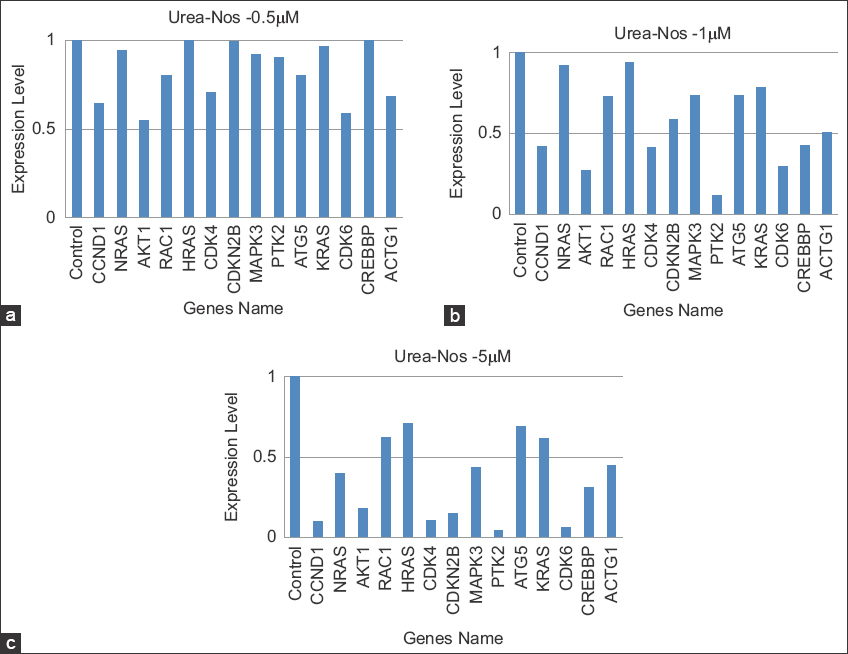 | Figure 8: Comparison of gene expression levels involves assessing the correlation between reverse transcription polymerase chain reaction (RT-PCR) results and transcriptome data to validate their expression levels. (a-c) Figures illustrate the downregulated genes and their expression levels under varying concentrations of urea-noscapine treatment. In the RT-PCR analysis, 14 genes affected by urea-noscapine treatment were specifically selected for examination. The expression levels of each gene were normalized in relation to untreated Hela cells for comprehensive analysis. [Click here to view] |