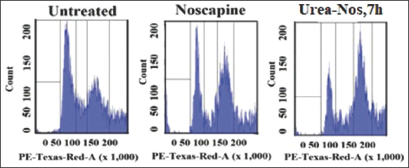 We studied the outcome of urea-noscapine at its IC50 concentration (4.8 µM) on the cell cycle distribution changes in Hela cells using flow cytometry (FACS) analysis. Following a 72-h treatment with urea-noscapine, notable alterations in the cell cycle profile were observed. The FACS analysis demonstrated a substantial aggregation of cells in the G2/M phase compared to the untreated control cells. In addition to the G2/M block, a distinct peak corresponding to hypodiploid DNA content (sub-G1) was observed to increase after 72 h of drug treatment. This progressive generation of cells exhibiting hypo diploid DNA content signifies fragmented DNA, indicative of apoptotic or dying cells.
