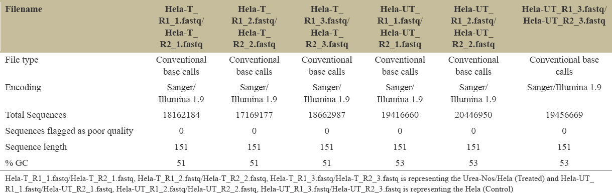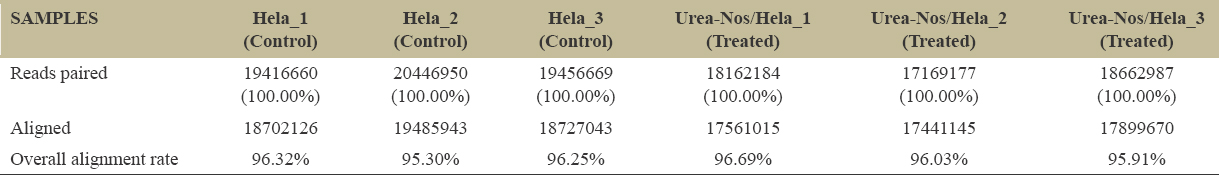 Toward quality assurance and accurate trimming, a combined 29.4 GB of raw data from untreated and treated Hela cells with urea-noscapine was used and presented in Table 2.