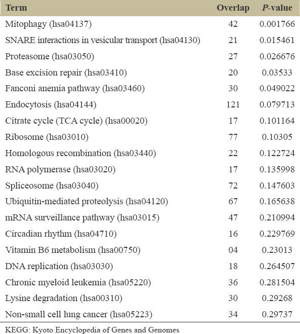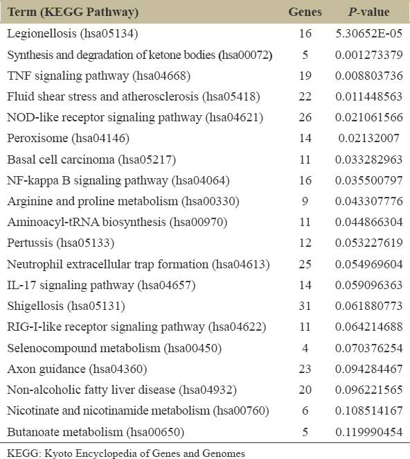 Table 5: The top KEGG pathways data of upregulated DEGs according to p-value. The total genes involve and KEGG Id.