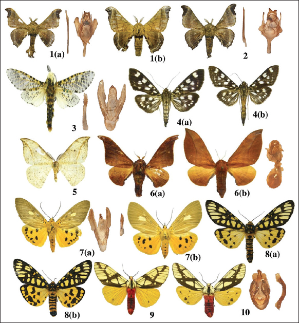 | Plate 1: 1-2 (Bombycidae): 1(a) Bombyx huttoni (Westwood, 1847) ♂, 1(b) Bomhyx huttoni (Westwood, 1847) ♀, 2) Bomhyx Mandrina (Moore, 1872)♂, 3(Cossidea): 3) Zeuzera multistrigata (Moore, 1881)♂, 4 (Crambidae): 4(a) Pygospila tyres (Cramer, 1780) ♂, 4(b) Pygospila tyres (Cramer, 1780) ♀, 5 (Drepanidae): 5) Drepana pallida (Moore, 1879) ♂, 6 (Endromidae): 6(a) Mustilia sphingiformis (Moore, 1879) ♂, 6(b) Mustilia sphingiformis (Moore. 1879) ♀, 7-10 (Erebidae): 7(a) Asota caricae (Fabricius, 1775) ♂ 7(b) Asota caricae (Fabricius, 1775) ♀, 8(a) Aglaomorpha plagiata (Walker, 1855) ♂, 8(b) Aglaomorpha plagiata (Walker, 1855) ♀, 9) Areas galactina intermedia (Rothschild, 1933) ♂, 10) Areas galactina orientalis (Walker, 1855) ♂. [Click here to view] |