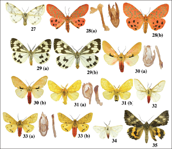 The most abundant species during the study was Nyctemera adversata (Schaller, 1788), which also belongs to the family Erebidae and subfamily Arctiinae (Arctiidae). The genitalia dissection of 54 moth’s samples was also performed. The moth’s population was found to be highest in the Kullu district, and the diversity of moths was highest in the months of July-September and declined from October onward. The photographs of all the identified species, along with their genitalia photograph are presented in Plates 1-9.