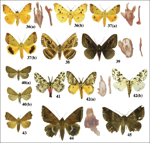 | Plate 4: 36-45 (Erebidae): 36(a) Hamodes propitia (Guerin-Meneville, 1831) ♂, 36(b) Hamodes propitia (Guerin-Meneville ♀, 1831), 37(a) Ophiusa tirhaca (Cramer, 1777) ♂, 37(b) Ophiusa tirhaca (Cramer, 1777) ♀, 38) Spirama helicina (Hubner, 1824) ♂ 39) Spirama retorta (Clerck, 1764) ♂, 40(a) Simplicia niphona (Butler, 1878), 40(b) Simplicia niphona (Butler, 1878) ♀, 41) Lymantria concolor concolor (Walker, 1855) ♂, 42(a) Lymantria Mathura subpallida (Moore, 1866) ♂,42(b) Lymantria Mathura subpallida (Moore, 1866) ♀ 43) Anomis mesogona (Walker, 1857) ♂, 44) Artena dotata (Fabricius, 1794) ♀, 45) Bastilla amygdalis (Moore, 1885) ♂. [Click here to view] |