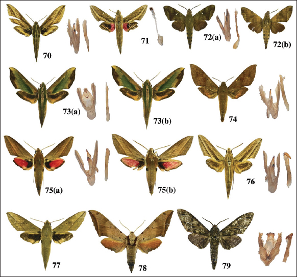| Plate 8: 70-79 (Sphingidae): 70) Cechetra lineosa (Walker, 1856) ♂, 71) Hippotion celerio (Linnaeus, 1758) ♀, 72(a) Nephele hespera (Fabricius, 1775) ♂, 72(b) Nephele hespera (Fabricius, 1775) ♀, 73(a) Pergesa acteus (Cramer 1779) ♂,73(b) Pergesa acteus (Cramer 1779) ♀ 74) Rhagastis olivacea (Moore, 1872) ♂, 75(a) Theretra alecto (Linnaeus, 1758) ♂, 75(b) Theretra alecto (Linnaeus, 1758) ♀, 76) Theretra oldenlandiae (Fabricius, 1775) ♂, 77) Theretrs Sp. ♂ 78) Ambulyx lahora, (Butler 1875) ♀, 79) Dolbina sp. ♂. [Click here to view] |