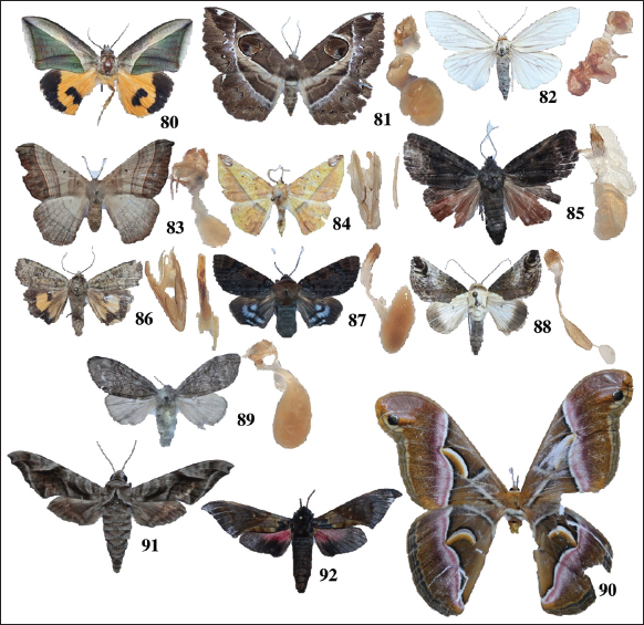 | Plate 9: 80-82 (Erebidae): 80 Eudocima salaminia (Cramer, 1777) ♀, 81 Erebus ephesperis (Hubner, 1827) ♀, 82 Himala argentea (Walker, 1855) ♀, 83 (Eupterotidae): Apona caschmirensia (Kollar, 1844) ♀, 84 (Geometridae): Pseudomiza aurata (Wileman, 1915) ♂, 85-87 (Noctuidae): 85 Amphipyra cupreipennis (Moore, 1882) ♀, 86 Xestia semiherbida (Walke, 1857) ♂, 87 Arcte coerula (Guenee, 1852) ♀, 88 (Nolidae): Risoba prominens (Moore, 1881) ♀, 89 (Notodontidae): Pheosia albivertex (Hampson, 1892) ♀, 90 (Saturniidae): Samia canningi (Hutton, 1859) ♀, 91-92 (Sphingidae): 91 Acosmeryx anceus subdentata (Rothschild and Jorean, 1903) ♂, 92 Anambulyx elwesi (H. Druce, 1882) ♂. [Click here to view] |
