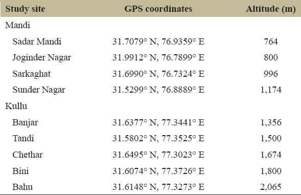 The current research work was done from August 2020 to October 2020 and June 2021 to October 2021. The nine sampling sites were selected based on the difference in their altitude, starting from 750m to 2,000 m above the main sea level. Out of which 4 belong to Mandi (Sadar Mandi, Joginder Nagar, Sarkaghat, and Sunder Nagar) and 5 belong to Kullu (Banjar, Tandi, Chethar, Bini, and Bahu) for the collection of the samples of moth. Kullu and Mandi districts lie in the Northwestern hilly state of India and are also part of the Western Himalayan region. It is one of India’s eleven mountainous states and covers around 55,673 sq. km, or roughly 5.8% of the country’s total land area. Himachal Pradesh is located at latitude 30°22’N and longitude 75°02’E. 5.57 million hectares of land are covered by a height range of 460–6,600 m.