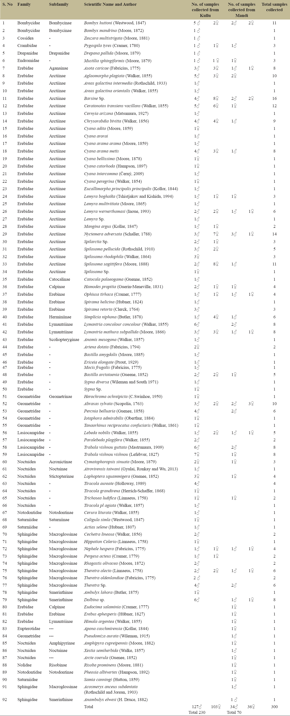 The current research work was done to estimate the biodiversity of the moths (lepidoptera) from Kullu and Mandi Districts of Himachal Pradesh. The moth sample was collected between August 2020 and October 2020 and between June 2021 and October 2021. The nine sampling sites were selected based on the difference in their altitude, starting from 750 m to 2,000 m above the main sea level. Out of which 4 belong to Mandi (Sadar Mandi, Joginder Nagar, Sarkaghat, and Sunder Nagar) and 5 belong to Kullu (Banjar, Tandi, Chethar, Bini, and Bahu) for the collection of the samples of moth. The final result of the research work was the collection of a total of 300 samples (230 from Kullu and 70 from Mandi) of moths belonging to 82 species, 67 genera, 20 subfamilies, and 14 families (Bombycidae, Cossidae, Crambidae, Drepanidae, Endromidae, Erebidae, Eupterotidae, Geometridae, Lasiocampidae, Noctuidae, Nolidae, Notodontidae, Saturniidae, and Sphingidae) were collected, preserved, and identified as shown in Table 3.
