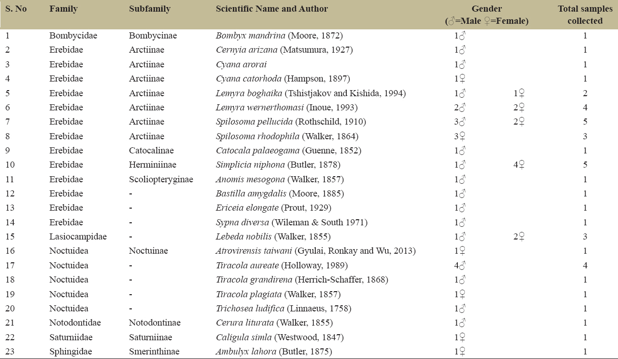 | 1 | Bombycidae | Bombycinae | Bombyx huttoni (Westwood, 1847) | 5 ♂ | 2♀ | 2♂ | 2♀ | 11 |