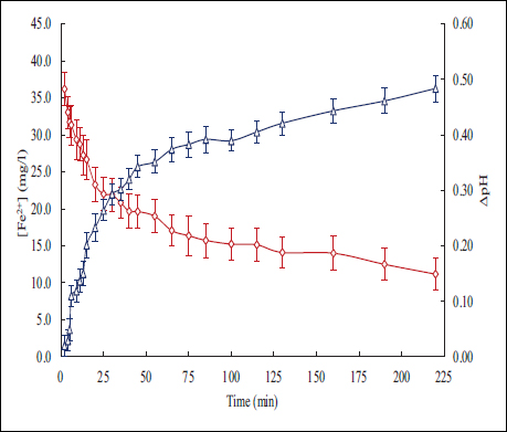 | Figure 1: Ferrous ion concentration (diamonds) and ΔpH (triangles) time course during vinasse (33% v/v) pretreatment with airflow of 0.27 l of air/(l of vinasse.s).