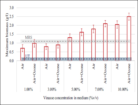 LAB cultures in media prepared with pretreated vinasse and MRS components were compared at concentrations ranging from 1 to 10% v/v of final vinasse concentration to visualize the effect of treatment in the maximum biomass accumulation. As shown in Figure 2, the differences in biomass concentrations obtained in each medium ranged from 0.1 to 0.4 g/L, increasing the biomass as the fermentable sugar concentration increases as a result of higher proportion of vinasse in the final medium.