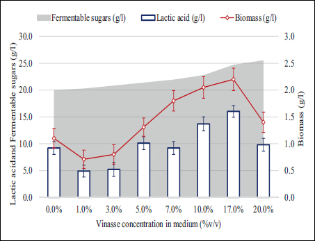 | Figure 3: Lactic acid, fermentable sugars, and biomass maximum concentrations in 24 h batch cultivation using media prepared with pretreated vinasse.