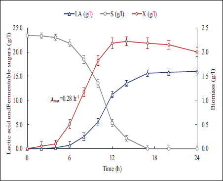 | Figure 4: Lactic acid (LA), fermentable sugars (S), and biomass (X) time course of concentrations in LAB cultures with 17% pretreated vinasse.