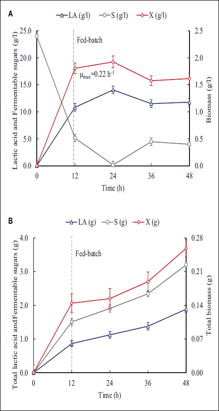 Considering the high volume of vinasse generated in the region, fed-batch operation was proposed as an alternative to increase the utilization of this residue as substrate for LAB cultivation. For this purpose, vinasse was added after 12 h of fermentation in pulses to observe the response of LAB to vinasse addition. The results presented in Figure 5 evidence a sustained growth over 48 h, in contrast to that observed in batch operation [Figure 4]. The dilution effect due to medium addition after the 24th h decreases the biomass concentration slightly [Figure 5A]. Nevertheless, the biomass concentration remains almost constant during the fed-batch phase as the dilution is approximately equal to the growth rate.