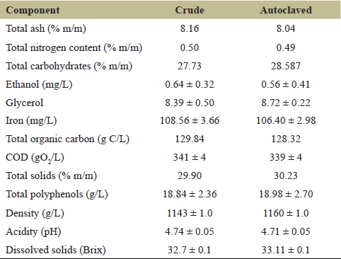 Table 1 presents the results of vinasse characterization obtained from the last evaporation cycle in which vinasse by-product of the bioethanol distillation is concentrated up to 32.7 ± 0.1 °Brix. For utilization in microbiological cultures, vinasse was autoclaved as described earlier. It is important to highlight that vinasse in the distillery has been subjected at temperatures close to those arisen in an autoclave. Since the vinasse has suffered an extensive thermal process, it is expected that most of the temperature-sensitive compounds have already reacted, and, therefore, the composition before and after autoclaving remained almost constant. In this case, the registered variation in the total sugar concentration and total dissolved solids were lower than 5.0%.