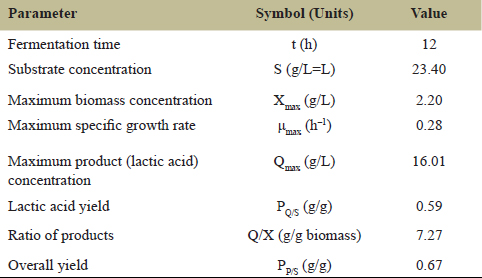 | Maximum product (lactic acid) concentration | Qmax (g/L) | 16.01 |