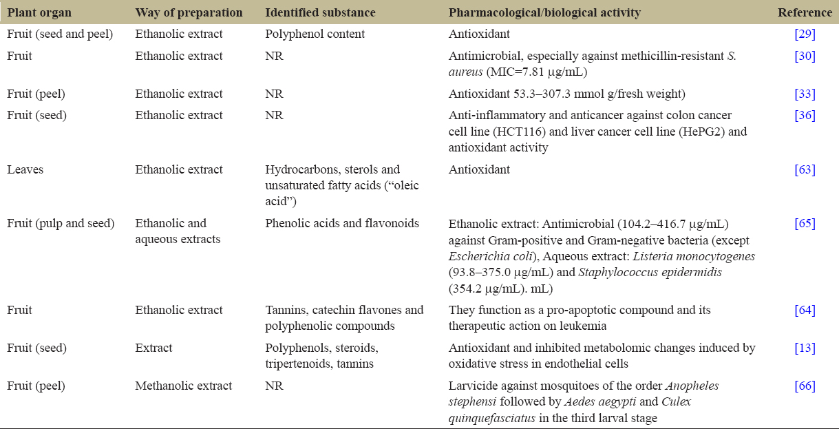 | Fruit (peel) | Ethanolic extract | NR | Antioxidant 53.3–307.3 mmol g/fresh weight) | [33] |