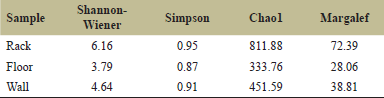 Table 1. Alpha diversity indices of rack, floor, and wall pool.