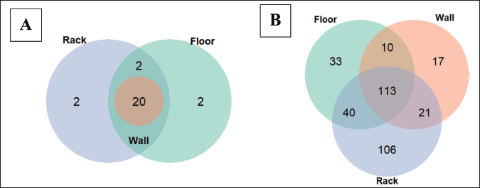 Comparison of diversity between samples was measured through Bray–Curtis dissimilarity and weighted Unifrac, which considered species abundance (Table 2). From the calculation, it was found that the rack had a significant difference compared to the other samples (0.72 and 0.66). However, when phylogenetics was considered, the wall-rack difference (0.27) was less significant compared to diversity (0.3). Beta diversity analysis further showed that the rack had significant diversity among two other samples.