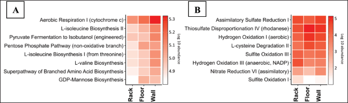 The abundance of the pathway did not differ significantly between the rack and wall samples. However, on the floor, it was observed that anaerobic hydrogen oxidation and assimilative nitrate reduction were lower compared to the other two samples. The nitrate-reduction pathway indirectly contributes to MIC by oxidizing iron spontaneously [39]. The low anaerobic oxidation of hydrogen can be explained by the low abundance of SRB, such as Desulfovibrio sp. These bacteria use hydrogen oxidation to acquire electrons in the absence of oxygen [40].