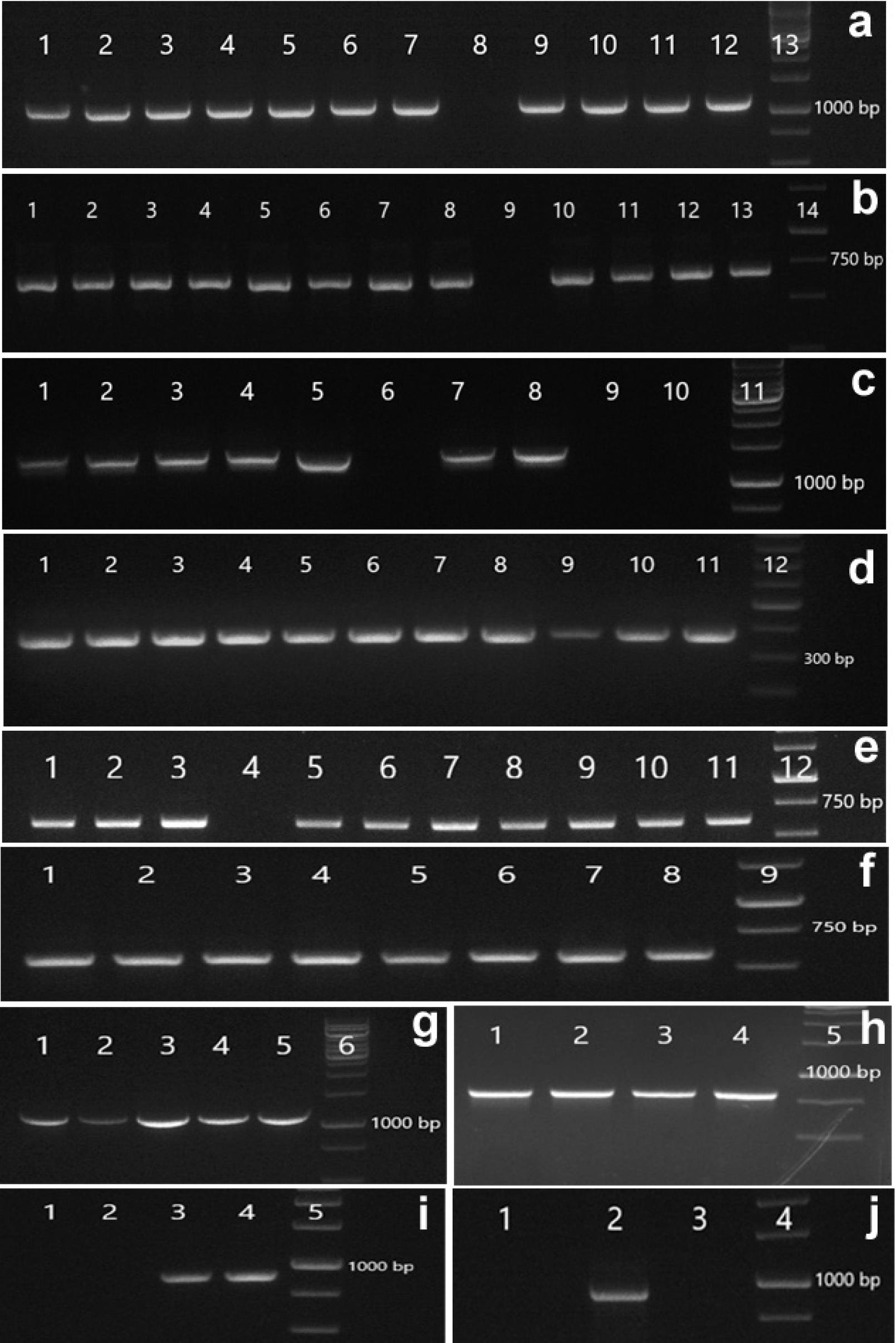 ![]() | Figure 1. Results of PCR amplification of cDNA of potato varieties and wild Solanum species with primers of late blight resistance gene markers.* (a) R2-1137: 1- 2359-13, 2- Sudarynya, 3- Svitanok kievskij, 4- 2372-60, 5- Lugovskoj, 6- Brjanskij krasnyj, 7- S. demissum PI 161176, 8- S. stoloniferum 24263, 9- S. bulbocastanum 243512, 10- S. polytrichon 24463, 11- S. bulbocastanum 243508, 12- S. stoloniferum 24976, 13- Gene Ruler 1 Kb DNA Ladder; (b) R2-686: 1- 2359-13, 2- Sudarynya, 3- Svitanok kievskij, 4- 2372-60, 5- Lugovskoj, 6- Brjanskij krasnyj, 7- S. demissum PI 161176, 8- S. stoloniferum 24263, 9- S. microdontum 25390, 10- S. bulbocastanum 243512, 11- S. polytrichon 24463, 12- S. bulbocastanum 243508, 13- S. stoloniferum 24976, 14- Gene Ruler 1 Kb DNA Ladder; (c) R3a-1380: 1- 2359-13, 2- Caprice, 3- Sudarynya, 4- Svitanok kievskij, 5- Alouette, 6- Zhukovskij rannij, 7- 2372-60, 8- Brjanskij krasnyj, 9- S. bulbocastanum 243512, 10- S. polytrichon 24463, 11- Gene Ruler 1 Kb DNA Ladder; (d) R3b-378: 1- 2359-13, 2- Caprice, 3- Sudarynya, 4- Svitanok kievskij, 5- Alouette, 6- Zhukovskij rannij, 7- Golubizna, 8- 2372-60, 9- Brjanskij krasnyj, 10- S. demissum PI 161176, 11- S. stoloniferum 24263, 12- Gene Ruler 100 bp Plus DNA Ladder; (e) Rpi-vnt1.3: 1- Svitanok kievskij, 2- Alouette, 3- Zhukovskij rannij, 4- Lugovskoj, 5- Brjanskij krasnyj, 6- S. demissum PI 161176, 7- S. stoloniferum 24263, 8- S. microdontum 25390, 9- S. bulbocastanum 243512, 10- S. polytrichon 24463, 11- S. okadae 25394, 12- Gene Ruler 1 Kb DNA Ladder; (f) Rpi-chc1-572: 1- 2359-13, 2- Caprice, 3- Sudarynya, 4- 2372-60, 5- Lugovskoj, 6- Brjanskij krasnyj, 7- Desiree, 8- S. avilesii 20884, 9- Gene Ruler 1 Kb DNA Ladder; (g) R1-1206: 1- 2359-13, 2- Svitanok kievskij, 3- Zhukovskij rannij, 4- 2372-60, 5- S. demissum PI 161176, 6- Gene Ruler 1 Kb DNA Ladder; (h) Blb1-821: 1- Sudarynya, 2- S. bulbocastanum 243512, 3- S. bulbocastanum 243508, 4- S. stoloniferum 24976, 5- Gene Ruler 1 Kb DNA Ladder; (i) Rpi-sto1: 1- Sudarynya, 2- S. bulbocastanum 243512, 3- S. bulbocastanum 243508, 4- S. stoloniferum 24976, 5- Gene Ruler 1 Kb DNA Ladder; (j) Blb2 -953: 1- S. stoloniferum 24263, 2- S. bulbocastanum 243512, 3- S. stoloniferum 24976, 4- Gene Ruler 1 Kb DNA Ladder. *Results are presented only for samples that were positive in genomic DNA analysis with the corresponding SCAR markers (see Table 2 [Click here to view] |