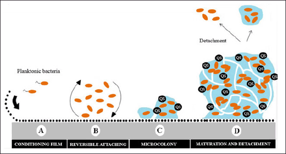 Any surface can produce biofilms in three primary stages. Cells attach to a surface in the first stage, assemble to create microcolonies, and then differentiate into a mature structure called a biofilm. After the complete development of biofilm, its disassembly or dispersion takes place through both mechanical and active processes [13–15]. External factors that affect the formation process include temperature, pH, gravitational and hydrodynamic pressures, Brownian motions, the type of surfaces that are inhabited, quorum sensing (QS), secondary messengers, and other signaling molecules. The microbes then proliferate and integrate into a network made of extracellular polymeric molecules that it has created by assembling its own parts. The formation of biofilms, especially during the early attachment stages, is facilitated by a number of surface-related proteins, including OmpA, fibronectin binding proteins, 31 protein A, 32 SasG, 33, 34, biofilm-associated protein (BAP), 35, 36, and numerous additional elements. Some species cannot attach to a surface but can anchor themselves to the matrix or directly to the earlier colonies. Small signaling molecules with the help of cell-cell communication systems mediate this colonization [16,17].