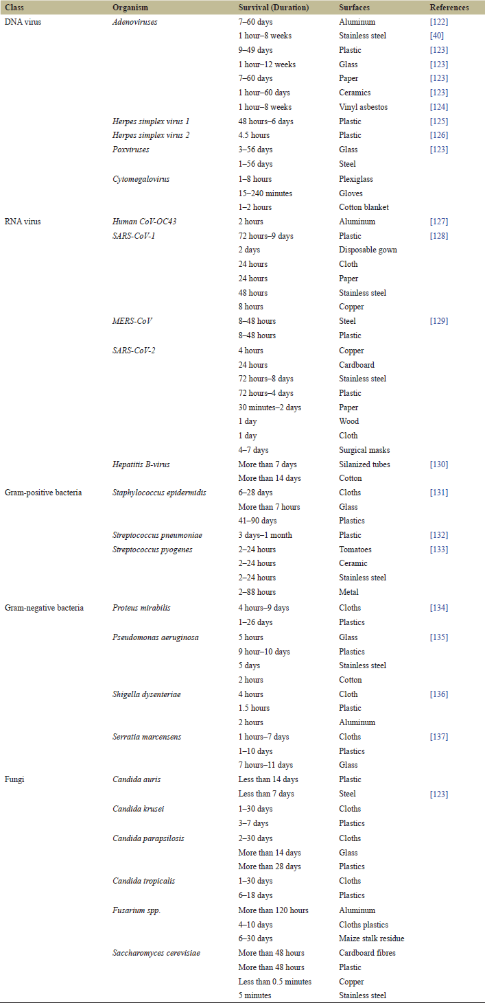 ![]() | Table 1. Survival of various microbes on different surfaces. [Click here to view] |