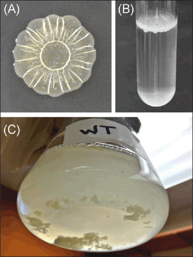 ![]() | Figure 2. Examples of Salmonella biofilm formation. (A) Colonies grown for 48 hours at 28°C on solid 1% tryptone media form the characteristic surface patterns of the red, dry, and rough (rdar) morphotype. The colony appears red when the media is supplemented with the dye Congo red. (B) Pellicle formation at the air–liquid interface of a 1% tryptone liquid culture. (C) Salmonella form multicellular aggregates and planktonic cells within the bulk liquid phase of a flask culture. Adapted from MacKenzie et al. [65]. [Click here to view] |
