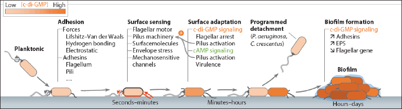 ![]() | Figure 3. Timeline of bacterial surface adaptation leading to biofilm formation. Adopted from Laventie and Jenal [121]. [Click here to view] |