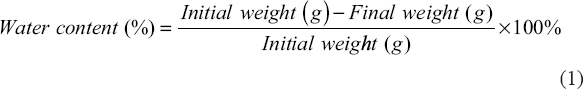 The water content of gandarusa leaves was analyzed to determine the initial moisture content, which can influence the fermentation process. Porcelain dishes were preheated at 105°C in an oven for 30 min to remove residual moisture and then cooled in a desiccator for 30 min before weighing. A 2 g sample of powdered gandarusa leaves was placed in a porcelain dish and heated at 105°C for 3 h. After cooling in a desiccator, the sample was reweighed until a constant weight was achieved. Moisture content was calculated using following the equation (1):