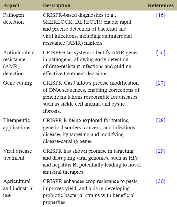 | Therapeutic applications | CRISPR is being explored for treating genetic disorders, cancers, and infectious diseases by targeting and modifying disease-causing genes. | [28] |
