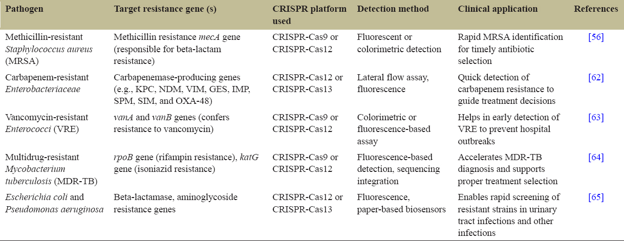 CRISPR-based diagnostics for AMR detection rely on the ability of CRISPR-Cas systems to recognize and cleave specific DNA or RNA sequences associated with resistance genes. The process begins with the collection of bacterial samples from clinical sources such as blood, urine, or sputum, followed by the extraction of nucleic acids. A CRISPR-associated enzyme, such as Cas12, Cas13, or Cas9, is programmed with a gRNA to specifically target known AMR genes. Upon successful binding, the enzyme cleaves the target sequence, activating a reporter molecule that generates a detectable signal. This signal can be visualized through fluorescence, colorimetric changes, or lateral flow strips, allowing for rapid and sensitive detection of resistance markers. The speed and accuracy of CRISPR-based diagnostics enable healthcare professionals to quickly identify resistant bacterial strains, facilitating timely and informed decisions regarding antibiotic treatment and reducing the spread of AMR [61]. The application of CRISPR-based diagnostics for AMR in different bacterial pathogens, highlighting the key features, CRISPR systems used, and their clinical relevance [Table 2].