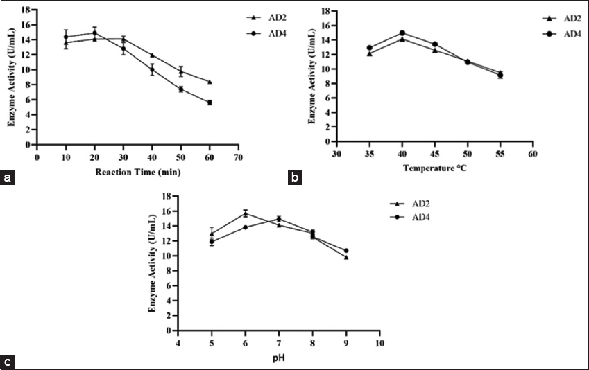 To ascertain the ideal pH for amylase production, the pH is varied between 5.0 and 9.0. It resulted in the maximum amylase production at pH 6.0 for AD2 and pH 7.0 for AD4 [Figure 2c]. The majority of the starch-degrading bacterial strains had a pH range of 6.0–7.0 for proper growth and enzyme production [60]. Adjusting the pH of the medium can improve the efficiency of amylase production and subsequent biochemical processes involving these isolates. This outcome was comparable to E. cloacae IIT-BT 08’s optimal pH of 6.0 for amylase production [50]. A. mongoliensis and A. veronii NS07 were also reported to have optimal enzyme production at pH 7.0 [36,61]. The pH of fresh fecal samples of herbivores was in a range from 5.82 to 8.32, and bacterial diversity has been demonstrated to peak at neutral pH and progressively decline below and above neutral pH [62,63]. Multiple lines of evidence imply that the activity and structure of numerous membrane proteins are influenced by ambient pH, which has direct consequences on bacterial metabolic rates [64,65]. The strain and culture medium also have a major role in determining the ideal pH for growth and amylase synthesis. From a biotechnological perspective, industrial processes are better suited for amylolytic organisms that function ideally at pH 5.0–8.0. Numerous industrial applications, including the textile industry, the production of fuel, the chocolate industry, and liquefaction, are compatible with this pH range. Furthermore, the amylase enzyme works best at a pH range of 5.5–7.0 for de-sizing processes in textile industries. These enzymes have the benefit of being starch-specific, meaning they can eliminate starch without causing harm to the support fabric [58].