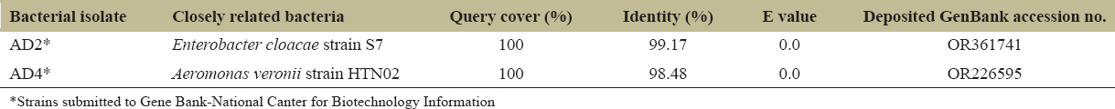 Bacterial isolates (AD2 and AD4) were also subjected to 16S rRNA gene sequencing for molecular-based identification of bacteria. Bacterial isolate AD2 showed 99.17%, while AD4 showed 98.48% similarity in NCBI databases when compared using the BLAST. These results confirmed that AD2 and AD4 bacterial isolates belong to the genera Enterobacter and Aeromonas, respectively. The 16S rRNA gene nucleotide sequences from AD2 and AD4 were submitted in the NCBI’s GenBank database with the accession numbers OR361741 and OR226595, respectively [Table 3]. The phylogenetic tree of isolates AD2 and AD4 was generated using gene sequences in MEGA 11.0 by the maximum likelihood method, as shown in Figure 1.