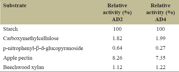 Various substrates such as CMC, p-nitrophenyl- β-D-glucopyranoside (pNPG), beechwood xylan, amylum, and apple pectin were used to determine the substrate specificity of the crude extract of bacterial isolates AD2 and AD4 [40]. The 900 μL reaction mixture containing 600 μL of 1% (w/v) substrate dissolved in 50 mM phosphate buffer, pH 7.0, and 300 μL of crude enzyme was initially incubated at 37°C for 20 min and further incubated for 10 min in a boiling water bath after the addition of DNS solution. Finally, absorbance was measured at 540 nm using a spectrophotometer [41].