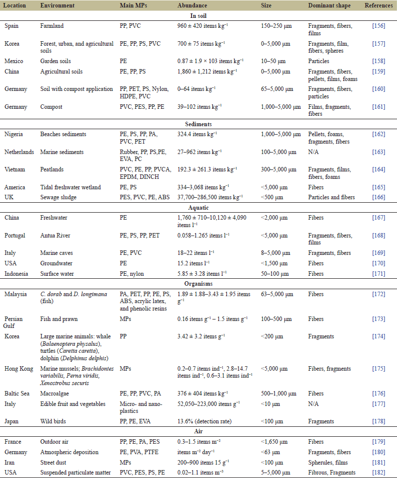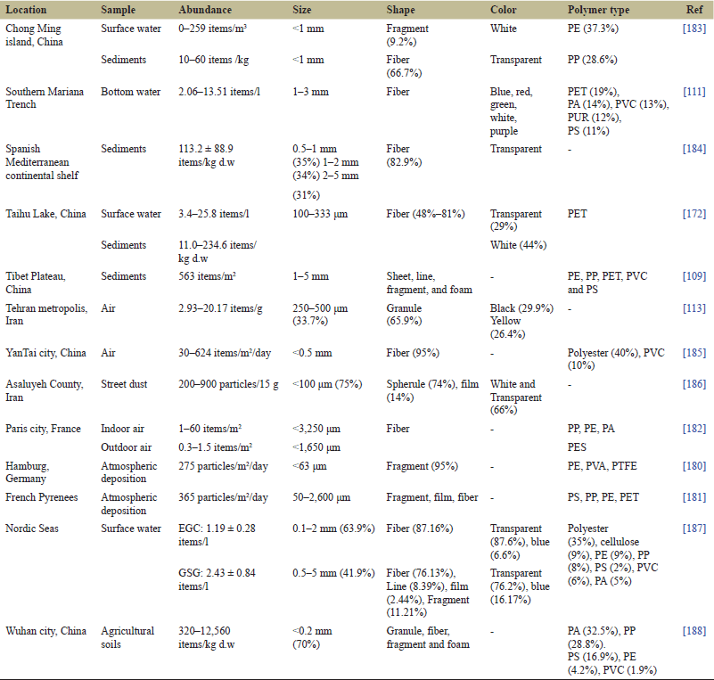 ![]() | Table 1. Distribution characteristics of MPs in environmental ecosystems. [Click here to view] |