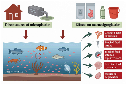 MPs cause bodily harm to the organism and can accumulate in the whole body. Organisms can cause constipation, tissue damage, or disturbance of normal state physiological processes [25]. MPs can adsorb and accumulate toxic chemicals in the environment, accordingly measures against persistent OPs and HMs. These chemicals can leach and enter tissues through MPs if swallowed, possibly microorganisms causing toxic effects such as synthetic particles may lead to chronic inflammation and increase the risk of neoplasia [26]. MPs have been proven to have an inducing effect on immune response and inflammation creature. Inflammation can cause health problems, including tissue damage and weakened immune function [27]. MPs can be accidentally ingested by marine organisms such as confused creatures and organism’s leftovers. This ingestion can cause improper diet or eating habits resulting in lower growth, lower energy imbalance, and malnutrition [27]. MPs can affect nature, reproductive success, and survival, possibly causative organism population-level impacts and changes in ecological processes [26]. Considering different environments have different biological communities, ambient circumstances, and interactions with pollutants, different ecosystems are affected by MPs in different ways. In light of these variables, MPs behave differently in every ecosystem, having different impacts on both the environment and organisms (Fig. 1).
