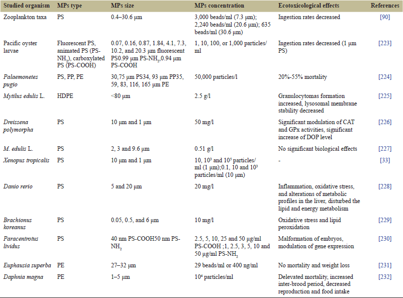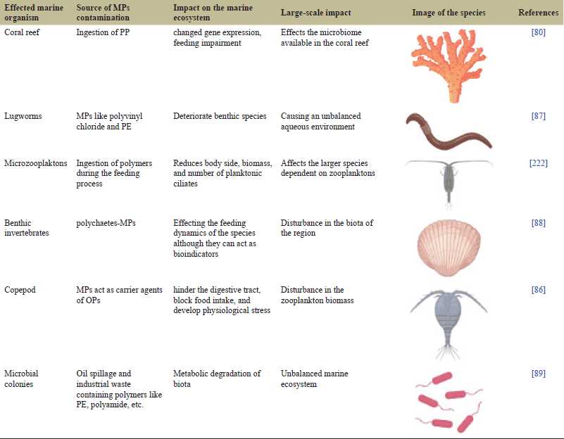![]() | Table 5. A detailed study of various marine organisms which are affected by MPs. [Click here to view] |