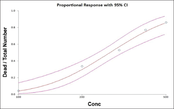 Figure 1 shows the acute toxicity test of B. plicatilis 24 h-LC50 values exposed to 100–500 μg/L TCS, and by Probit analysis, related confidence intervals of 95% of TCS were determined and listed in Table 1. The 24 h-LC50 of TCS for Brachionus sp. was found to be 271.29 μg/L.