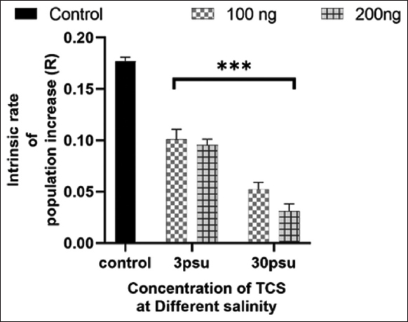 A reproductive bioassay was performed to provide the intrinsic rate of the population of rotifers in different salinities with TCS exposure [Figure 2]. The population growth rate shows a significant decrease as the concentration of TCS exposure increases at 3 and 30 psu. The lowest population growth rate was observed in the 200 ng/L at 30 psu TCS exposure group compared to the control.