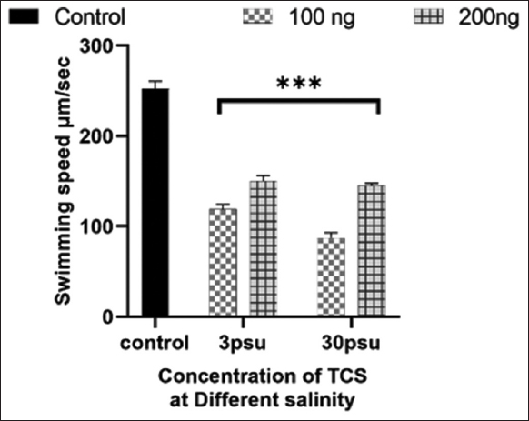 Figure 3 shows the effect of TCS in different salinity on the locomotor behavior of B. plicatilis. The average speed of rotifers was significant decreased in all the concentration of TCS in both salinities when compared with control. However, the maximum inhibition of rotifer speed was observed in the 100 ng at 30 psu.