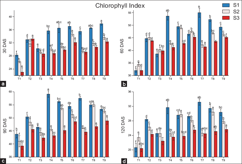| Figure 1: Effects of biochar application on the chlorophyll index at (a) 30 DAS, (b) 60 DAS, (c) 90 DAS, (d) 120 DAS, (S1) fresh biochar, (S2) one-season-old biochar, and (S3) two-season-old biochar. Different lowercases indicate significant differences between treatments (P < 0.05). [Click here to view] |