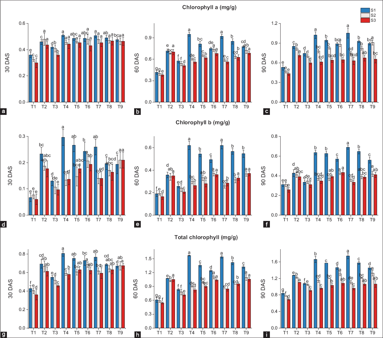 | Figure 2: Effect of biochar application chlorophyll “a” (a) 30 DAS, (b) 60 DAS, (c) 90 DAS chlorophyll “b” (d) 30 DAS, (e) 60 DAS, (f) 90 DAS and total chlorophyll, (g) 30 DAS, (h) 60 DAS, and (i) 90 DAS, (S1) Fresh biochar, (S2) One season old biochar (S3) Two season old biochar. Different lowercases indicate significant differences between treatments (P < 0.05). [Click here to view] |