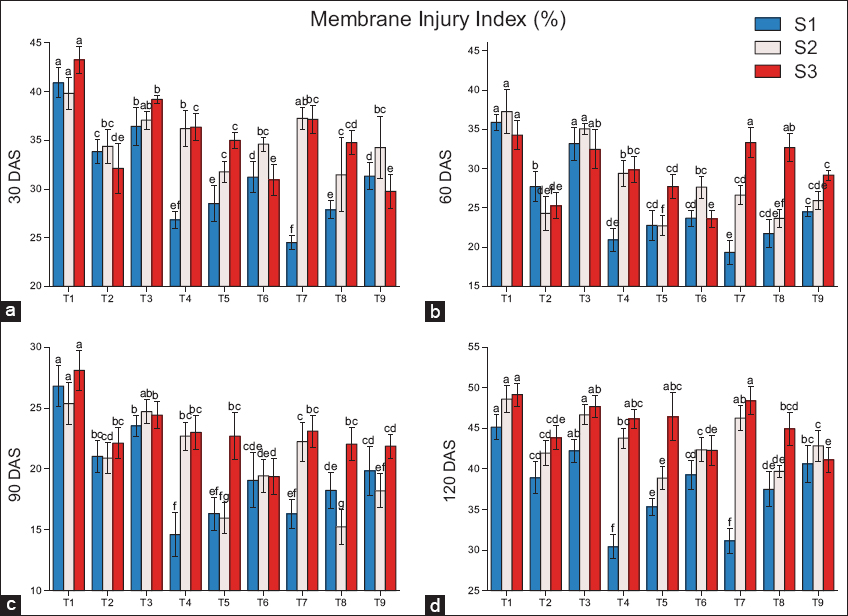 The injury index of the cell membrane is recorded more reduction in S1 as compared to residual biochar (S3 and S2) [Figure 4]. In fresh biochar (S1), compared to the control (T2), the maximum decline in the MII was recorded in T7, with reductions of 27.6% and 30.2% at 30 and 60 DAS, respectively. However, the maximum reduction shifted to T4 at later stages, with decreases of 30.5% and 21.8% at 90 and 120 DAS, respectively. For residual biochar (S2), compared to the control (T2), the maximum decline in the MII was recorded in T8, with a reduction of 4.5% at 30 DAS. However, the maximum reduction shifted to T5 at later stages, with decreases of 2.1%, 7.2%, and 5.3% at 60, 90, and 120 DAS, respectively. For residual biochar (S3), compared to the control (T2), the maximum decline in the MII was recorded in T9, with a reduction of 3.5% at 30 DAS. However, the maximum reduction shifted to T6 at later stages, with decreases of 2.2% and 3.6% at 60 and 90 DAS, respectively. At 120 DAS, the maximum decline in the MII was recorded in T9 (4.8%).