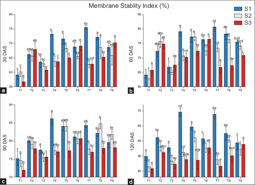 | Figure 5: Effects of biochar application on the membrane stability index at (a) 30 DAS, (b) 60 DAS, (c) 90 DAS, (d) 120 DAS, (S1) fresh biochar, (S2) one-season-old biochar, and (S3) two-season-old biochar. Different lowercases indicate significant differences between treatments (P < 0.05). [Click here to view] |