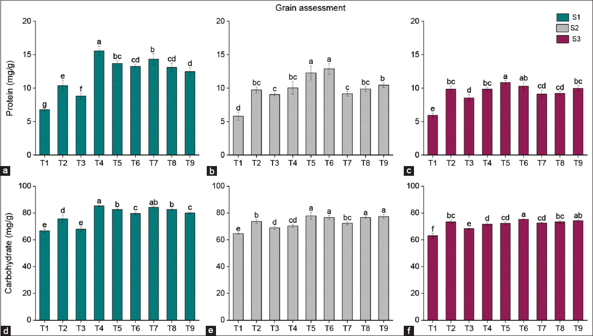 Fresh and residual biochar also significantly affected the carbohydrate concentration in grain. Compared to T2, fresh biochar (S1) resulted in the highest carbohydrate increase in T4 (12.7%) followed by T7 (11.4%). Among residual biochar treatments, S2 showed the greatest increase in T5 (5.9%) followed by T9 (5%), while S3 exhibited the maximum increase in T6 (2.7%) followed by T9 (1.4%) compared to T2.