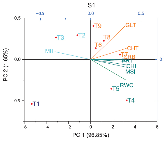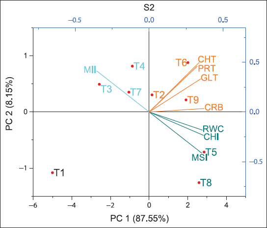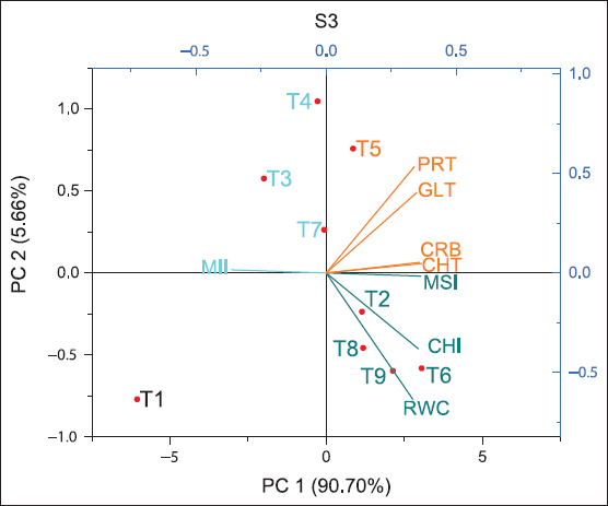 The biplot analysis revealed the interactions between different parameters and the respective treatments. Fresh biochar (S1) [Figure 8] related to PC1 and PC2 reflecting 98.5%, while residual biochar (S2) [Figure 9] 95.7% and residual biochar (S3) [Figure 10] 96.36% divergence in the observations. The first two components were geometrically represented in a Cartesian coordinate system, constructing a dimensional reduction framework to identify prominent discriminatory variables in the observation data. Fresh biochar (S1) In coordinate-1 T6, T7, T8, and T9 were clustered where vectors gluten (GLT), carbohydrate (CRB), and total chlorophyll (CHT) are showing, ensuring the strong bonding of gluten, carbohydrate, and total chlorophyll content with T6, T7, T8, and T9. Residual biochar (S2) In coordinate-1 T6, T9, and T2 were clustered where vectors Total Protein (PRT), GLT, CRB, and CHT are projecting, showing the great association of protein, gluten, carbohydrate, and total chlorophyll content with T6, T2, and T9. Residual biochar (S3) In coordinate-1 T5 was clustered where vectors PRT, GLT, CRB, and CHT are projecting, confirming the strong association of protein, gluten, carbohydrate, and total chlorophyll content with T5.