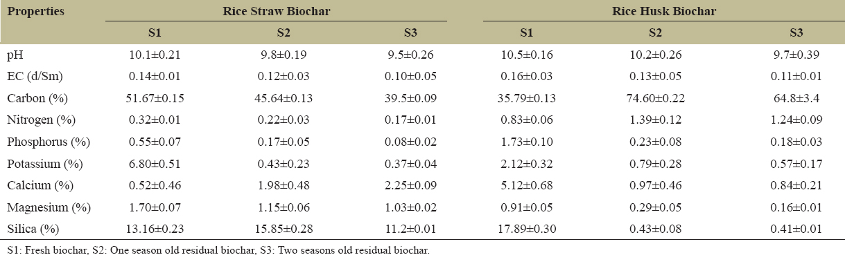 S1: Fresh biochar, S2: One season old residual biochar, S3: Two seasons old residual biochar.